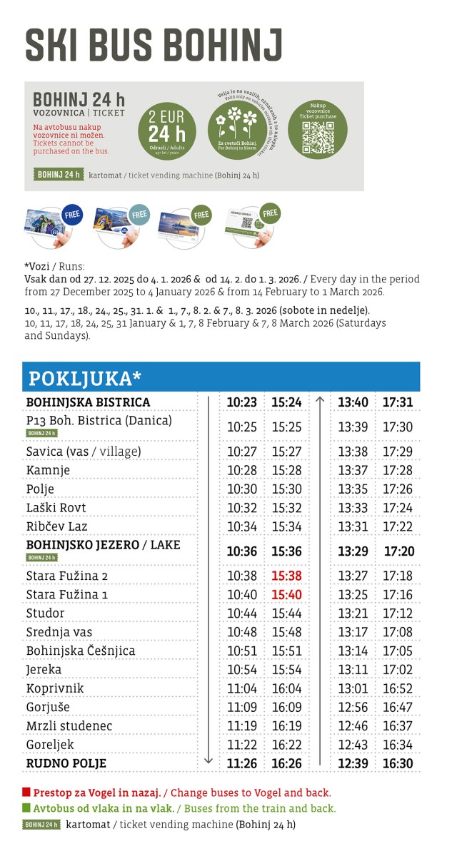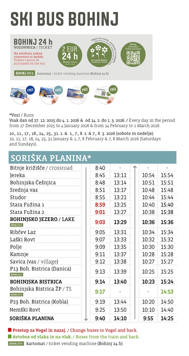 SKI BUS bo pričel voziti 27. decembra 2025. Na Vogel vozi večkrat dnevno vsak dan, na Soriško planino in Pokljuko pa ob vikendih, praznikih in vse dni v času šolskih počitnic. Preveri celoten vozni red v PDF obliki. Za prevoz je potrebno imeti Kartico Julijske Alpe: Bohinj (basic ali premium), vozovnico Bohinjc, voucher Slovenskih železnic (paket BohinjSKI vlak) ali vozovnico Bohinj 24 h. Nakup vozovnice Bohinj 24 h za SKI BUS na avtobusu ni možen.