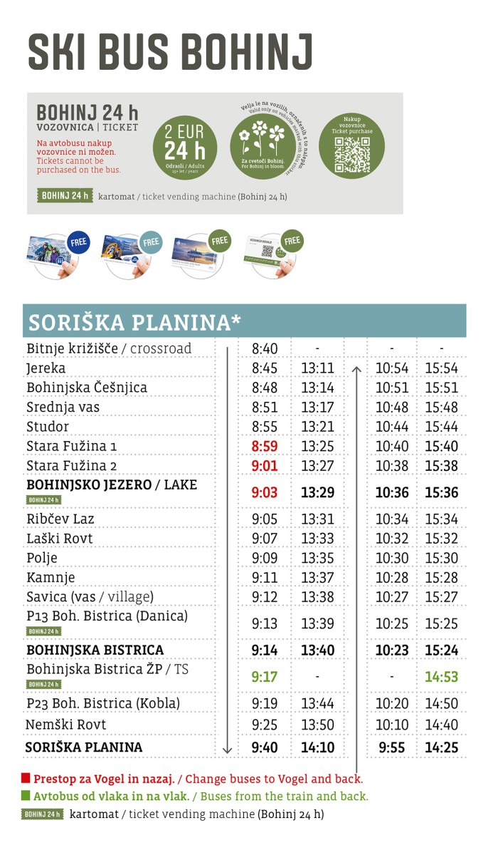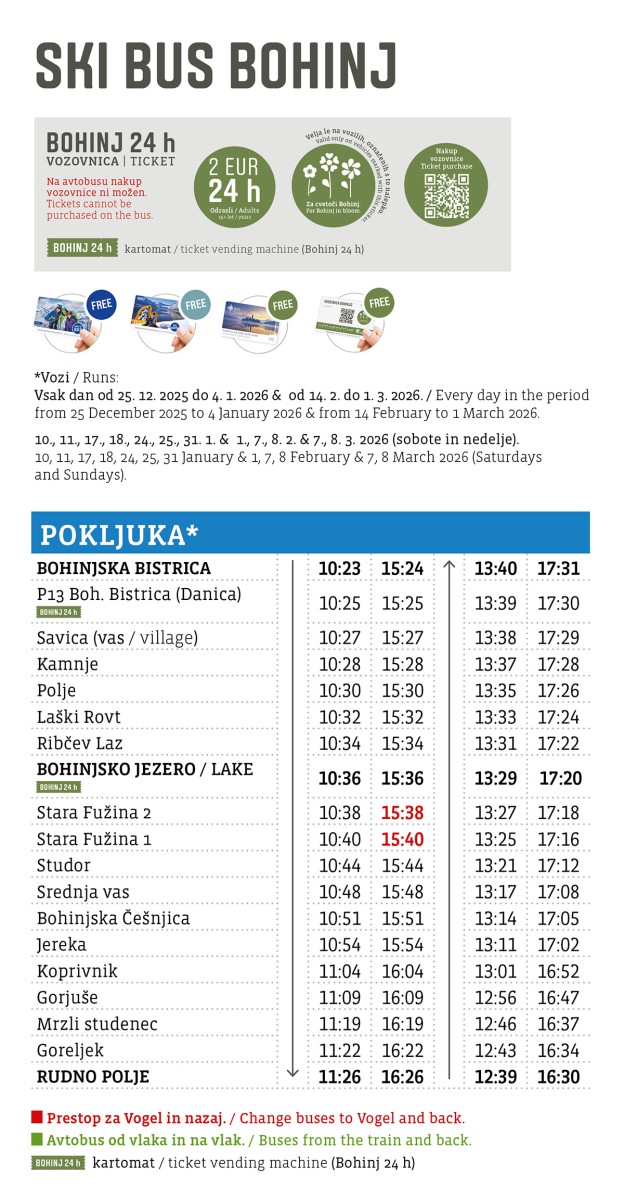 SKI BUS: If snow conditions are favorable, the SKI BUS will start operating on the 25. 12. 2025. Check the timetable: SKI BUS BOHINJ 2025/2026. It will drive to Vogel, Soriška planina, and Pokljuka. The SKI BUS will run several times a day every day to Vogel, and to Soriška planina and Pokljuka on weekends, public holidays, and every day during school holidays. For transportation, you must have a Julian Alps Card: Bohinj (basic or premium), a Bohinjc ticket, a Slovenian Railways voucher (BohinjSKI train package), or a Bohinj 24-hour ticket. It is not possible to purchase a Bohinj 24-hour ticket for the SKI BUS on the bus.