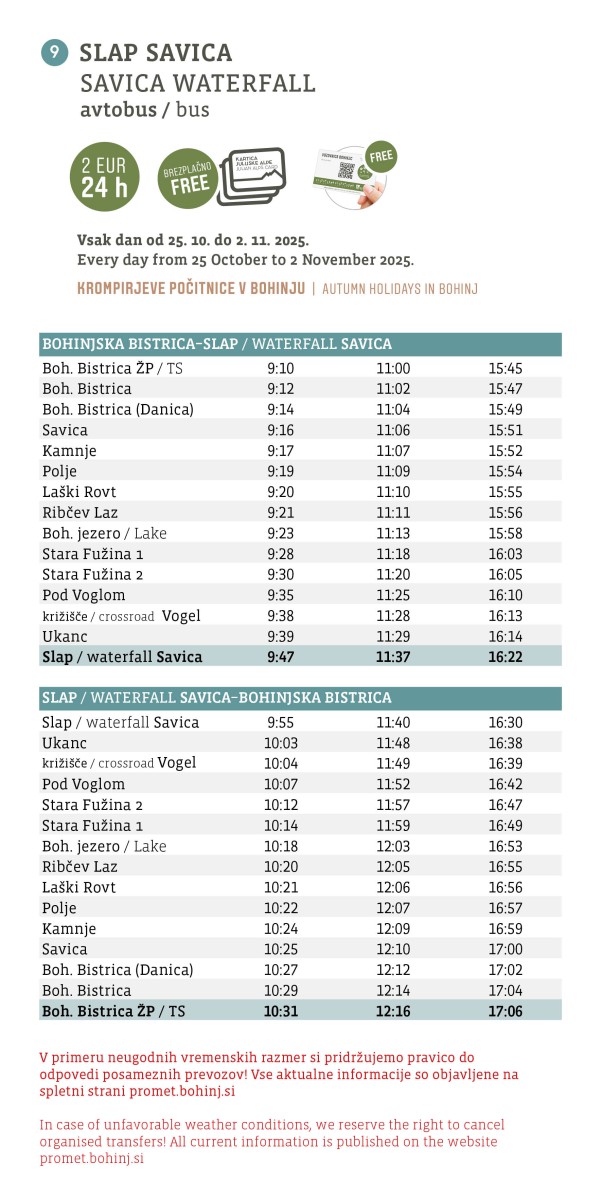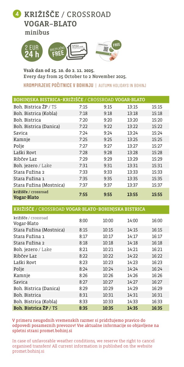 - Velja: 24 ur od prve aktivacije na avtobusu (samo na vozilih označenih z nalepko “Za cvetoči Bohinj”).